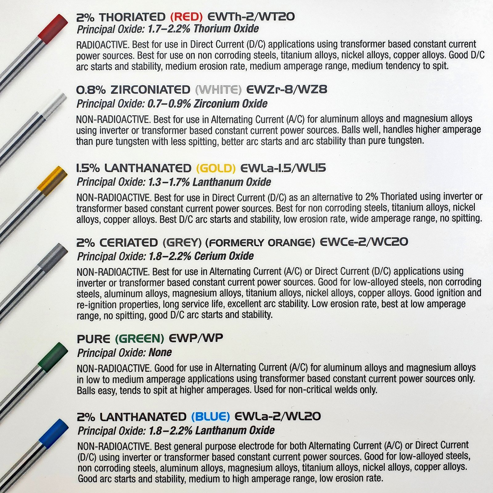 Performs well during low amperage starts.( 10% less amps than Thoriated material to operate)