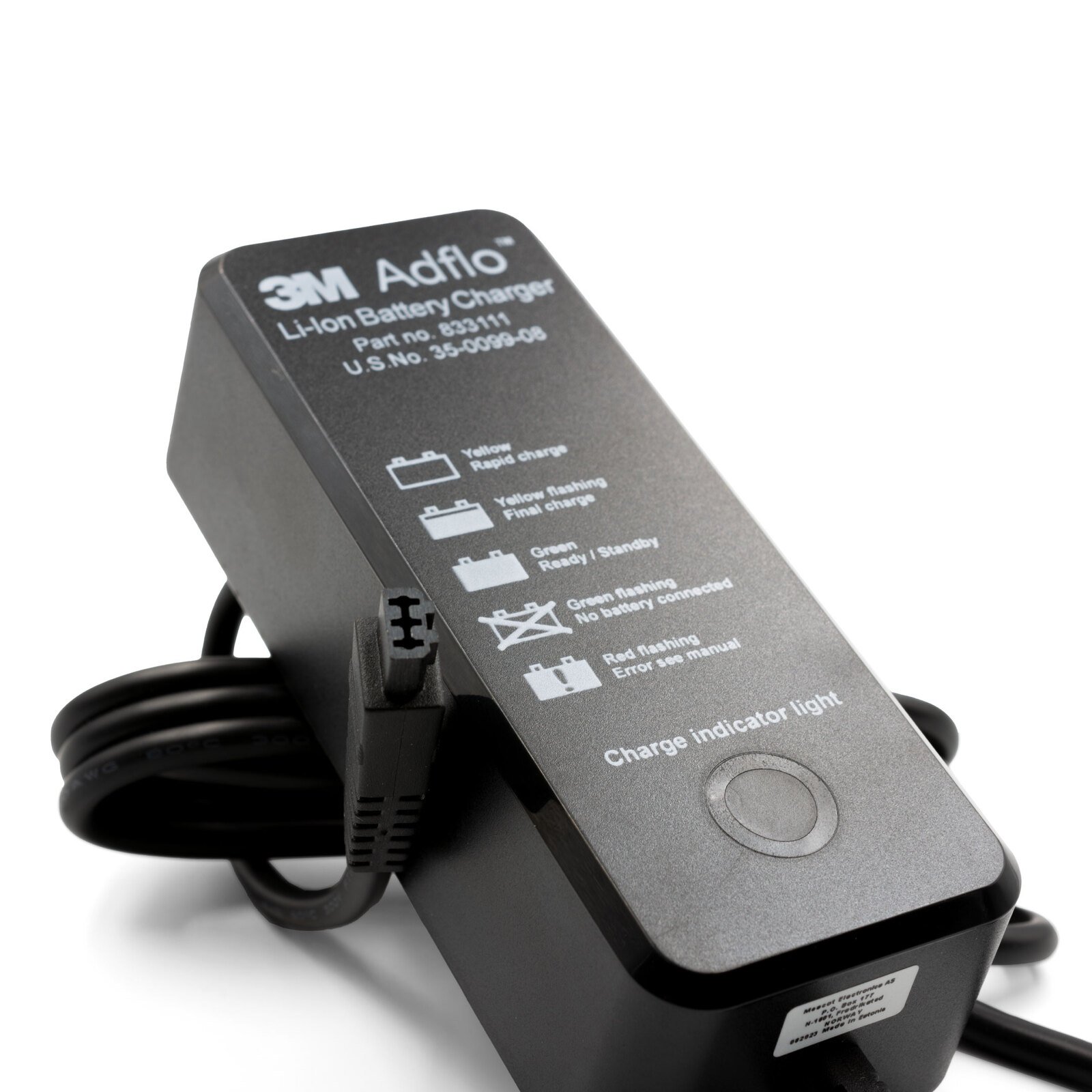Replacement battery charger for the upgraded Lithium-Ion battery (part number 833111) to suit 3M Adflo powered air respirator (black cover).