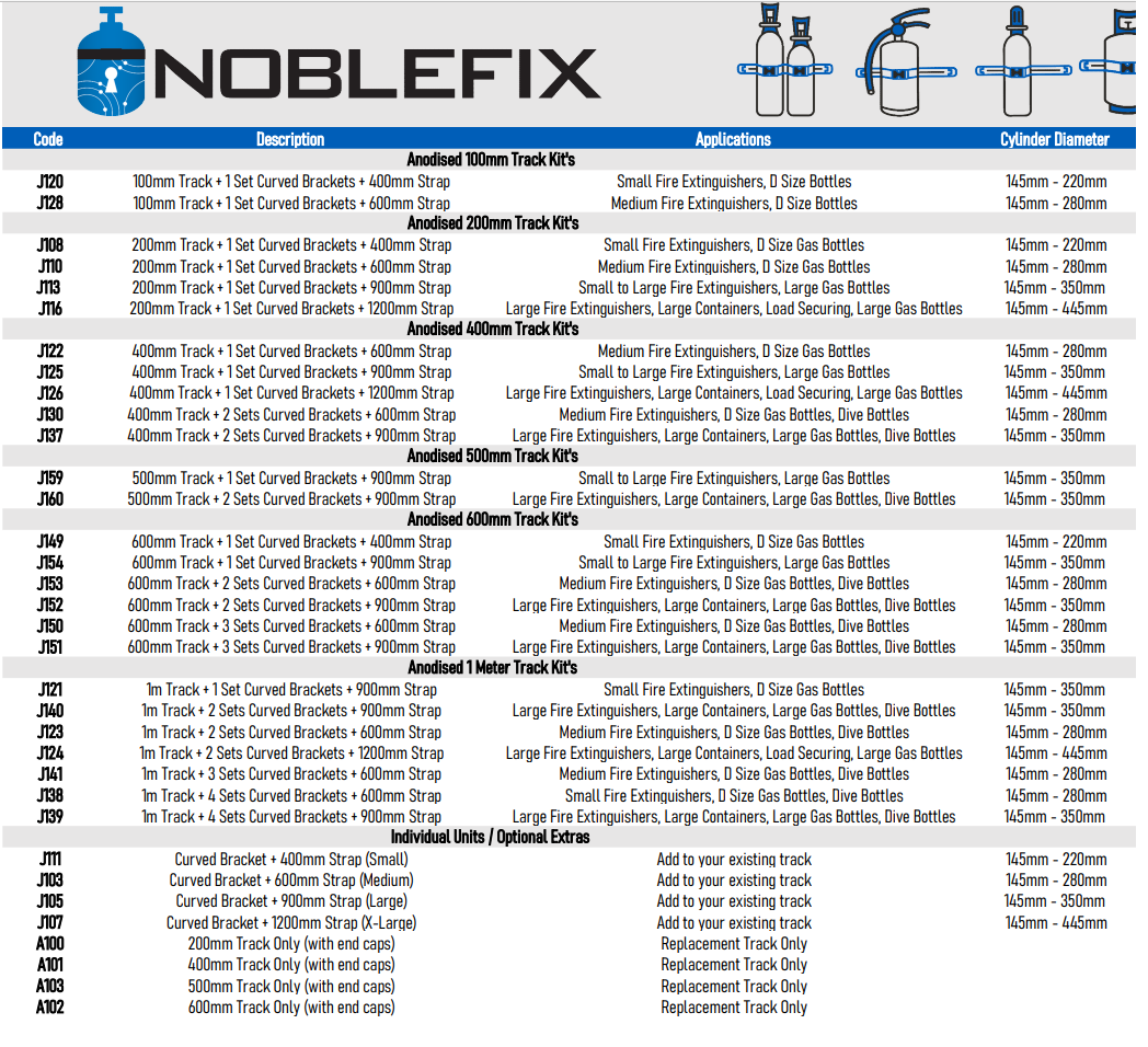 Hampdon Industrial stock the quality Australian-made and owned “NobleFix” range of bottle and equipment restraints. Adjustable, Extremely durable and versatile is just the start of the many features these restraints offer. The anodized aluminum track sections can be joined together to provide secure mass storage. The UV Stabilized Polypropylene brackets are made to last and the strong webbed strapping is available in varied lengths to suit your needs. NobleFix products have been independently tensile strength tested and can withstand 380 kilograms (3.5kN) of pressure to ensure OH&S practices are enhanced and not compromised. All components used to construct this product conforms to all relevant Australian Standards.